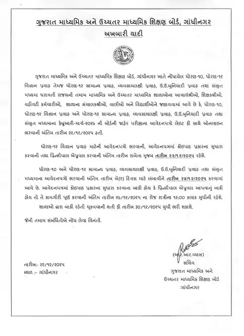 • ધોરણ-10 અને 12 સામાન્ય પ્રવાહ, વ્યવસાયલક્ષી પ્રવાહ, ઉ.ઉ.બોર્ડ અને સંસ્કૃત માધ્યમ માટે ફોર્મ ભરવાની અંતિમ તારીખ 24 ડિસેમ્બર 2025 નક્કી કરવામાં આવી છે.
