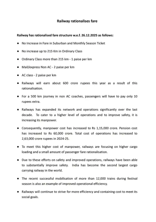 ભારતીય રેલવેએ લાંબા અંતરની મુસાફરી કરનારા મુસાફરો માટે ભાડામાં વધારાની જાહેરાત કરી છે. રેલવેનું નવું ભાડું 26 ડિસેમ્બર 2025થી અમલમાં આવશે. આ નિર્ણય મુજબ 215 કિલોમીટરથી વધુ અંતરની યાત્રા કરનાર મુસાફરોને હવે પ્રતિ કિલોમીટર 1થી 2 પૈસા વધારાના ચૂકવવા પડશે.