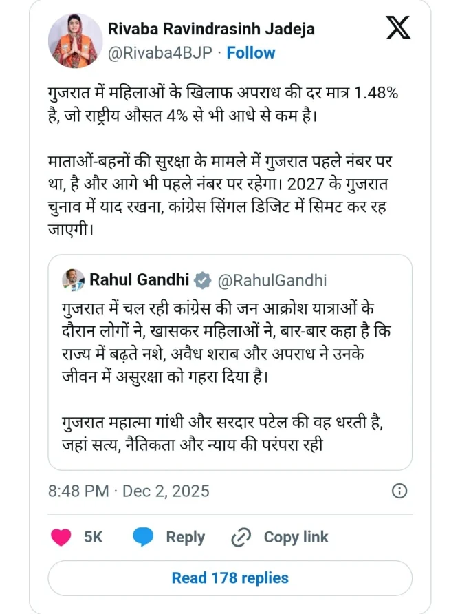 રાહુલ ગાંધીના આ નિવેદનના જવાબમાં, ગુજરાતના શિક્ષણ રાજ્યમંત્રી રીવાબા જાડેજાએ વળતો જવાબ આપ્યો. તેમણે કહ્યું કે રાજ્યમાં મહિલાઓ સામેનો ક્રાઈમ રેટ માત્ર 1.48% છે, જ્યારે રાષ્ટ્રીય સરેરાશ 4% છે. રીવાબાએ ઉમેર્યું કે માતાઓ અને બહેનોની સુરક્ષા માટે ગુજરાત સતત શ્રેષ્ઠ રાજ્ય રહ્યું છે અને આગળ પણ રહેશે.